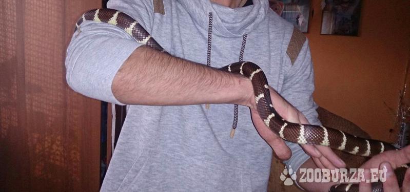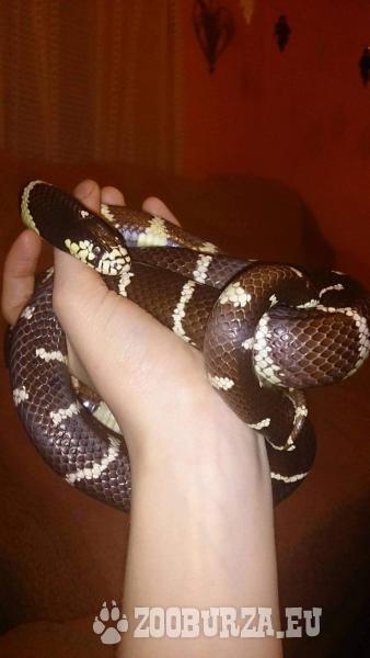 Popis: (Lampropeltis getulus californiae) Prodám našeho miláčka Káju, je to dospělý samec, velmi hodný, zvyklý na lidi, stáří cca 7let, délka cca 120cm, je ve výborné kondici, zvyklý na živou potravu, přímá dospělou myš zhruba jednou za 14dní, podle toho kdy dojde ke svleku. Svleky sou v celku bez potrhání na kousky. Cena je včetně terária, světla, misky na koupel a domeček.