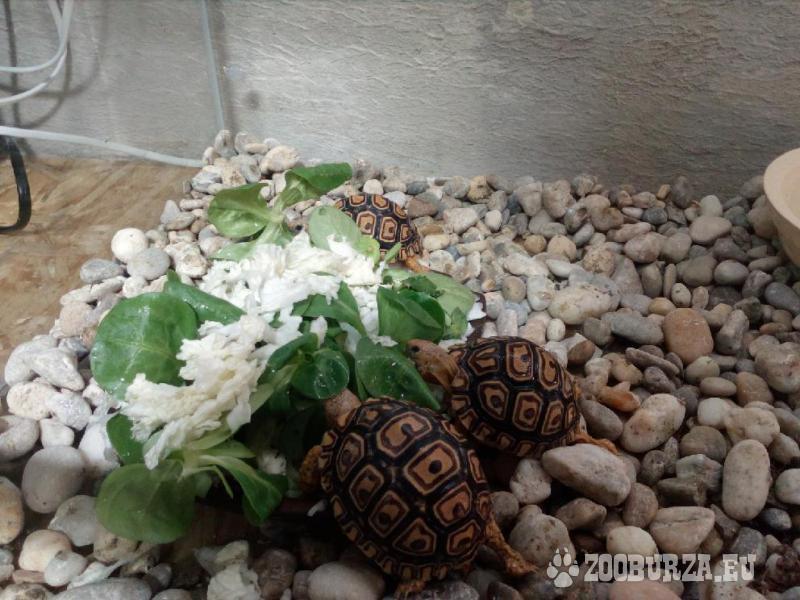 Popis: Vymazlená mláďata želv pardálích z vlastního malého chovu. Zdravá, vitální, pěkně rozkrmenná. Jedná se o africké suchozemské želvy, nezimující, druh nepodléhá registraci, dorůstají větších rozměrů. Možnost při odběru u nás si prohlédnout chovnou skupinu a chovné zařízení. Želvičky zdarma můžeme dovézt do Prahy, Kladna a okolí, případně zajistit přepravu po celé ČR. Chovatelský servis samozřejmostí.