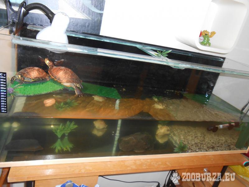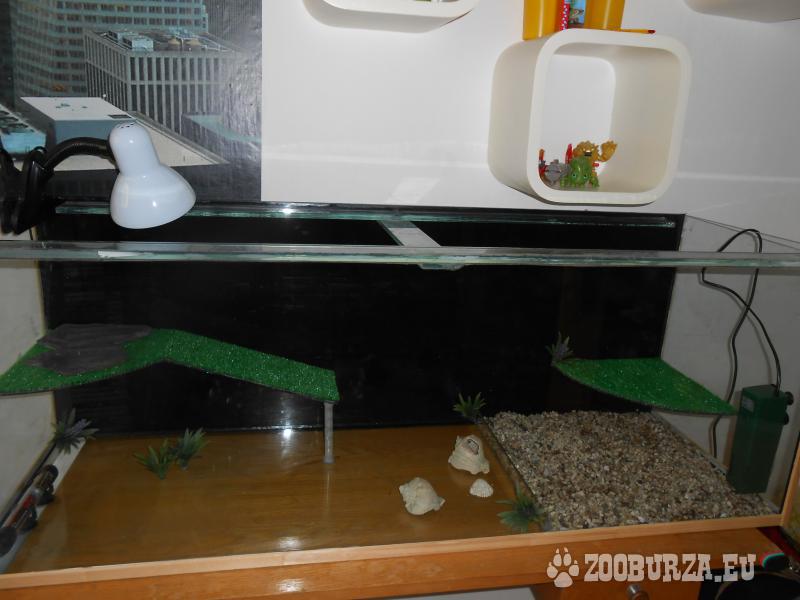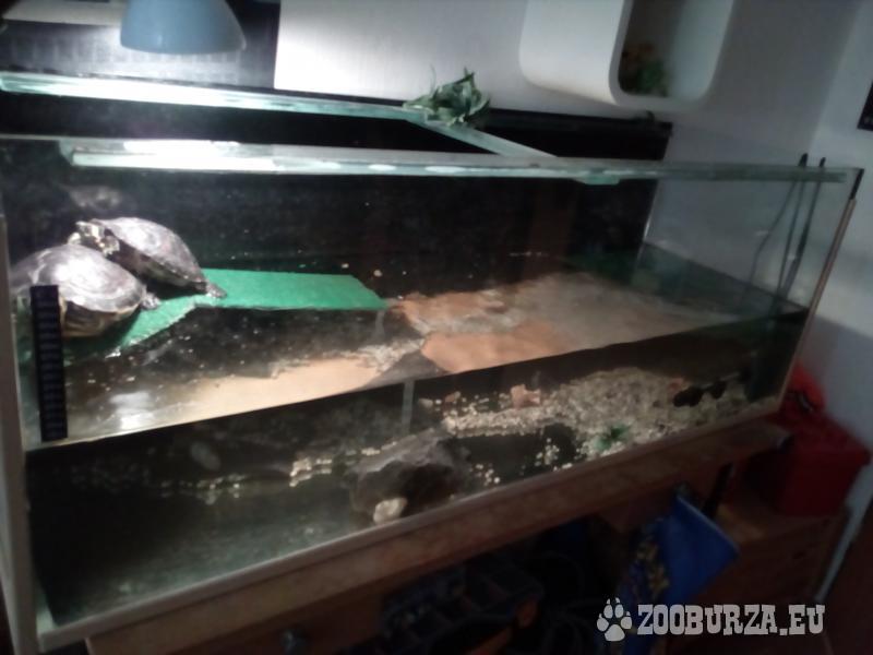 Popis: Kvůli nedostatku místa prodám želvárium -200litrů, 120cm délka x 44.5cm výška x 40,5cm šířka. Zánovní filr + zdarma jeden starý menší náhradní filtr, ohřívač vody, teploměr, kamínky , necelý měsíc stará žárovka+ sepiové kosti, a hlavně dvě zdravé a opravdu velké želvy žlutolící, které v listopadu budou mít dva roky. Nekoušou, lze krmit z ruky. Větší má přes 1kg.